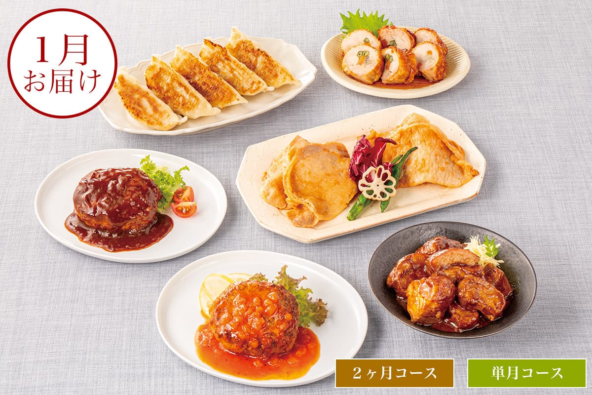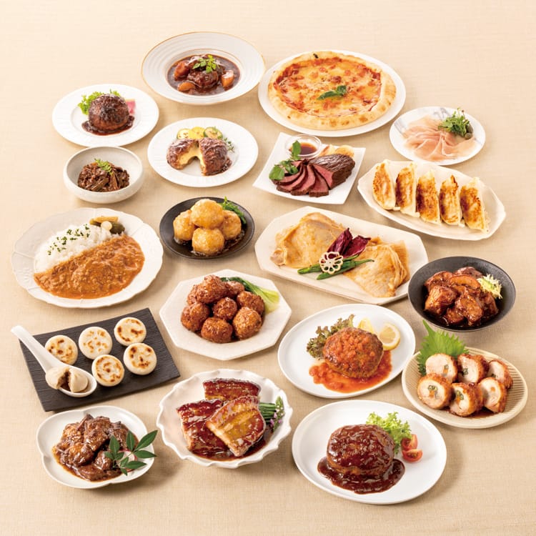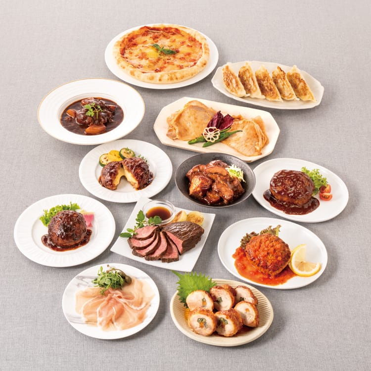 - 骨なしスペアリブ スパイシー味 400g、瀬戸内六穀豚使用大きな餃子680g(20個)、豚肉の味噌煮込み 210g、賛否両論 蒸し鶏の梅ジュレ仕立て 150g、賛否両論 鶏の照焼き 160g