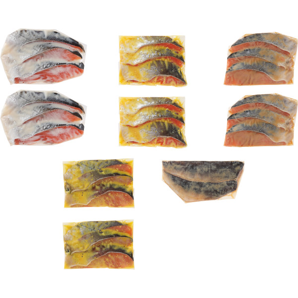 内容 ●秋鮭粕漬、秋鮭味噌漬、秋鮭西京漬、紅鮭西京漬 各3切(計240g)×各2、ホッケ味噌漬2切(計140g) 【賞味期限:60日】 【アレルゲン:小麦】 【白箱入】
