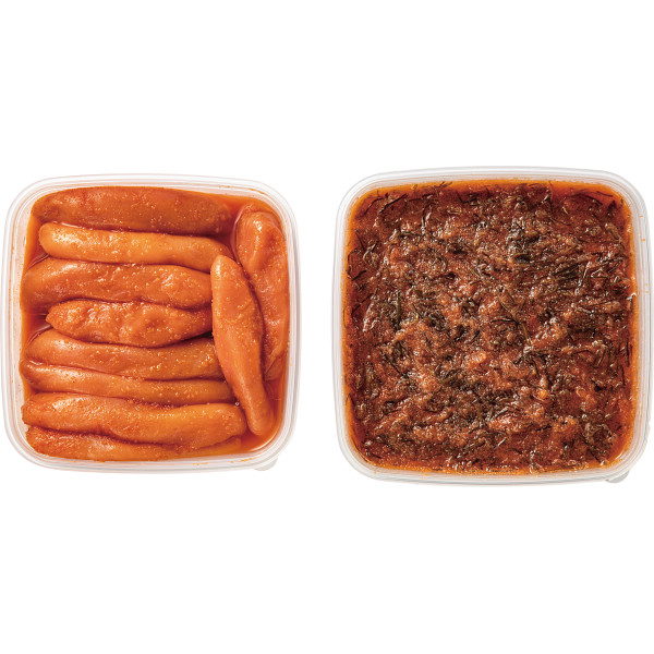 北海道近海で獲れるスケトウダラの卵にこだわり、柚子風味のたれで熟成させた博多辛子明太子と柔らくて美味しい昆布を国内製造の明太子で和えた昆布明太のセットです。