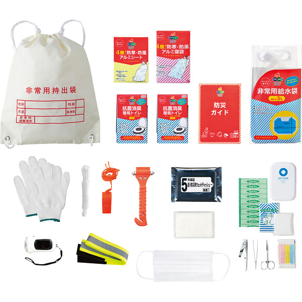 内容 ●両リュック・非常持出袋、4層!防寒・防風アルミシート、4層!防寒・防風アルミ寝袋、軍手、ロープ、笛、新反射安全タスキ、ソーラー&ダイナモLEDライト、抗菌消臭・簡易トイレ×2個、防災ガイド、防災用ウェットティッシュ(20枚入)、緊急脱出ハンマー、絆創膏5枚、綿棒10P、コットンパフ3枚、ワンタッチ包帯、爪切り、毛抜き、ハサミ、ポケットティッシュ、マスク1P、非常用給水袋3l 【白箱入】