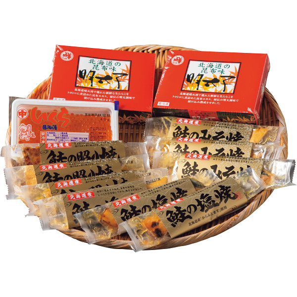 内容 ●昆布味明太子(すけとうだらの卵巣使用)120g×2、いくら醤油漬け(鮭卵)40g×1、鮭の塩焼き30g・鮭のみそ焼30g・鮭の照り焼30g×各3 【賞味期限:30日】 【アレルゲン:小麦】 【お届け期間:2024/6/1~2025/12/31】 【ボール箱入】