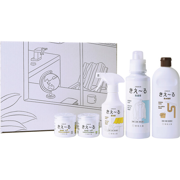 内容 ●セット内容=きえ~る室内用スプレー約300ml・きえ~るゼリータイプ(無香)約140g・きえ~るゼリータイプ(ミント)約140g・きえ~る(洗濯用)約600ml・きえ~る(排水管用)約500ml×各1  【化粧箱入】 【完成品】