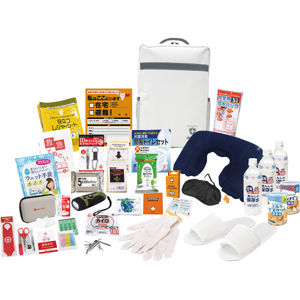 内容 ●収納リュック・リフレクター・IDホイッスル&カラビナリング・防災用ウェットティッシュ・軍手・アルミブランケット・防災の心得・ダイナモ多機能ライト・カンパン(100g)・ミルクビスケット(75g)・給水袋3L・スリッパ・カイロ・レインコート・8徳ナイフ・ネックピロー・アイマスク・耳栓・救急てぬぐい・ウェット手袋・レジャーシート・緊急避難カード・抗菌消臭簡易トイレ3回分・救急10点セット(医療機器届出番号:27B3X00138000001)・歯みがきティッシュ・5年保存水500ml×3・トランプ・水に流せるペーパー●保存水・保存食=賞味期間5年 【アレルゲン:乳成分・小麦】 【ボール箱入】