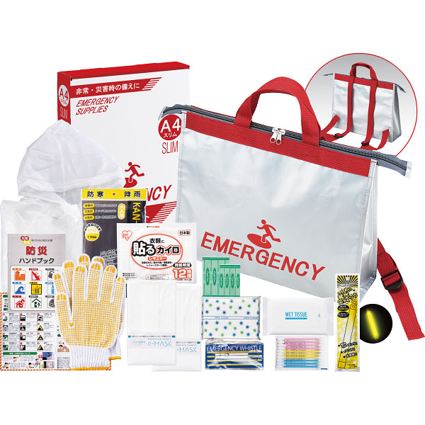 内容 ●トートリュック・発光スティックライト・ホイッスル・ウェットティッシュ(10枚)・ポケットティシュ・レインコート・カイロ・軍手・マスク×2・綿棒10本・防災ハンドブック・絆創膏(医療機器届出番号:27B3X00138000001) 【化粧箱入】