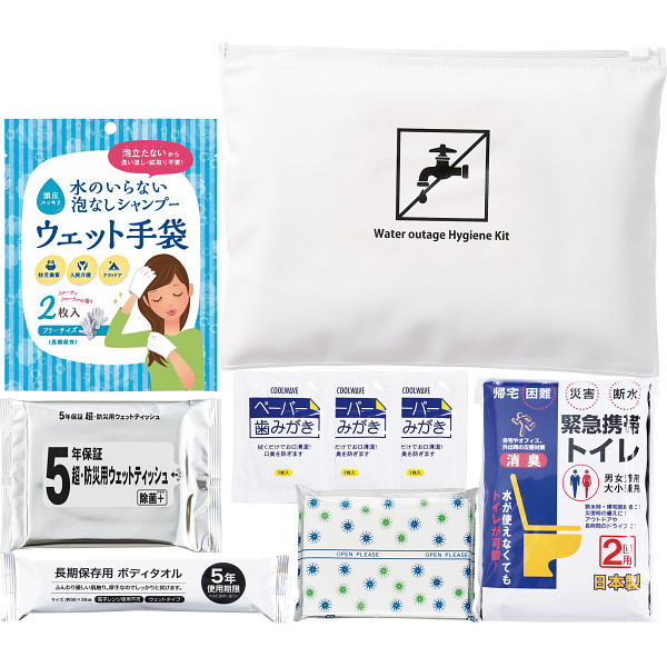 地震・台風など災害による断水時に、身の回りを清潔に保つ為の最低限のグッズをひとまとめにした衛生用品セットです。