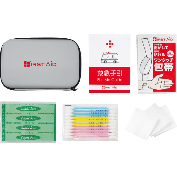 内容 ●収納ケース・救急手引・ワンタッチ包帯・絆創膏5枚(医療機器届出番号:27B3X00138000001)・綿棒10本・コットンパフ3枚×各1 【袋入】 【完成品】