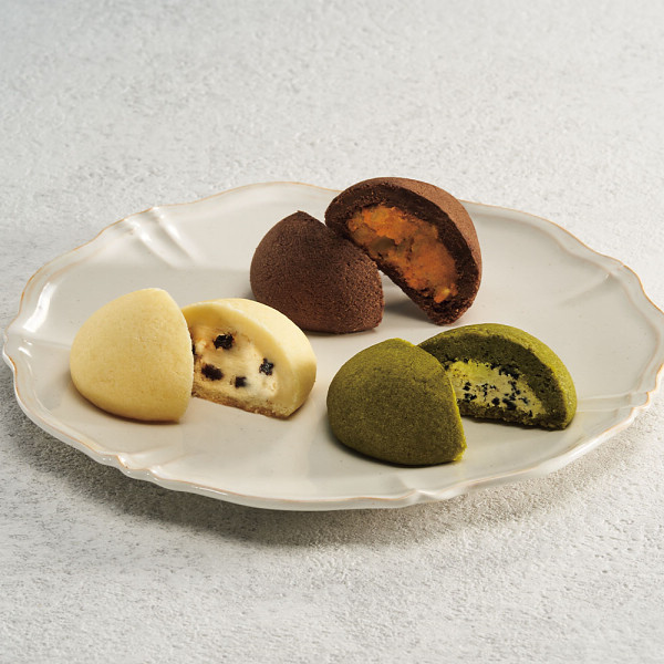 食感が楽しい素材がたっぷりつまった、包あん型のクッキー。【チョコクッキー&キャラメルナッツ】チョコ生地になめらかなキャラメルとサクサクナッツが入ったクッキー。【プレーンクッキー&ラムレーズン】プレーン生地にラムレーズンが入ったクッキー。【宇治抹茶クッキー&ココアビスケット】宇治抹茶の生地にザクザク感が楽しいココアビスケットが入ったクッキー。