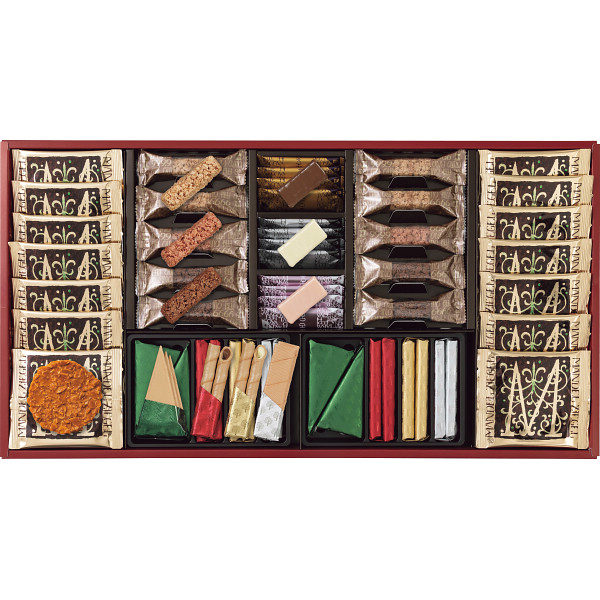 内容 ●エコルセ(三角3枚×4包、短冊2枚×4包、ミルクチョコ2本×4包、ホワイトチョコ2本×4包)、マンデルチーゲル×14、ショコラエコルセ(ミルクチョコ・ホワイトチョコ・ストロベリーチョコ×各4)、米粉クランチ(ミルクチョコ・ホワイトチョコ×各4、ラズベリーチョコ×2) 【アレルゲン:卵・乳成分・小麦】 【化粧箱入】