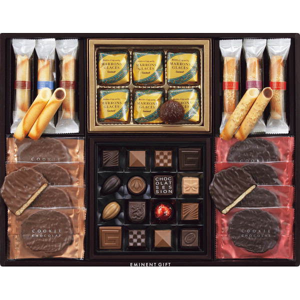 内容 ●エミネントチョコレート×16、コルベイユ×12、クッキーショコラ×8、マロングラッセ×6 【アレルゲン:卵・乳成分・小麦】 【化粧箱入】