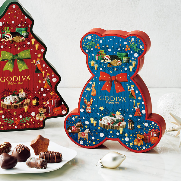 ホリデーシーズンを彩るブッシュ ド ノエルやお部屋で寛ぐペットたち、美しくラッピングされたギフトボックスなどを描いた、ブルーのベア形のパッケージに、ブッシュ ド ノエルを表現した限定チョコレートなどを詰め合わせました。