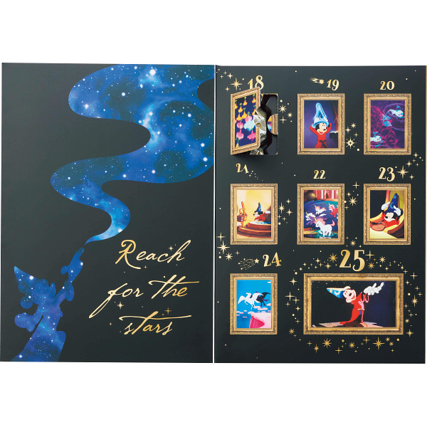 ブック形の8daysカウントダウンカレンダー。本を開くと作品中の1コマが描かれた8つの扉が出現。ミッキーアイコンをかたどった3種類の限定チョコレートやGキューブなどを、毎日1つずつ楽しめます。クリスマス当日には、『ファンタジア』公開85周年を記念して特別にデザインされたミッキーの限定ピンバッジ入り。