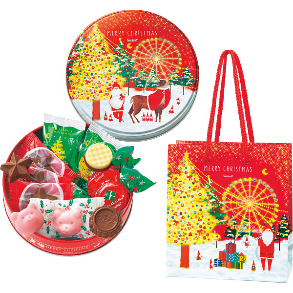 4種類のプレーンチョコレートをクリスマス専用の個包装で包み、クリスマスデザインの丸缶に詰合せました。