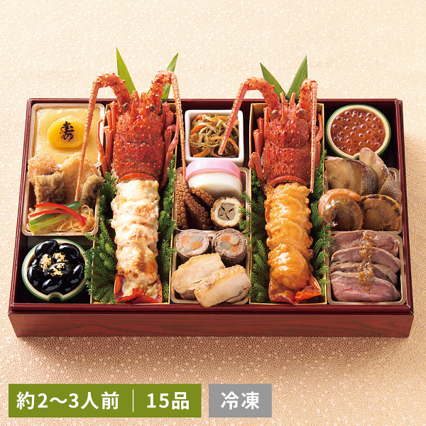 内容 ★<一の重>15品目:伊勢海老柚子マヨネーズ焼、伊勢海老オーロラソース焼、栗きんとん、鯛南蛮漬、黒豆、数の子松前漬、京かまぼこ、蛸旨煮、穴子八幡巻、牛肉野菜巻、鳥山椒焼、いくら醤油漬、ブリ照焼、帆立浜焼、ローストビーフ★ 【アレルゲン:卵・乳成分・小麦・えび】 【ボール箱入】