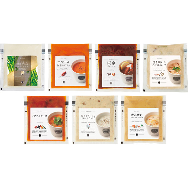 内容 ●素材を食べる聖護院かぶのポタージュ・オマール海老のビスク・東京ボルシチ・焼き鯛だしの和風スープ・ミネストローネ・鶏のポタージュフレンチ仕立て・オニオンクリームポタージュ 各180g×1 【アレルゲン:乳成分・小麦・えび・かに】 【化粧箱入】