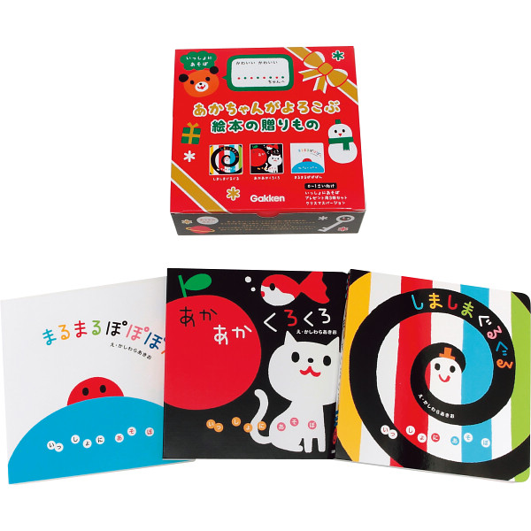 赤ちゃんが注目する黒を中心に、生後6か月未満でも見やすいコントラストの強い配色にデザインした人気のシリーズから、絵本『しましまぐるぐる』『あかあかくろくろ』『まるまる ぽぽぽん』の3冊をプレゼント用にセット。クリスマス向け化粧ケース付き