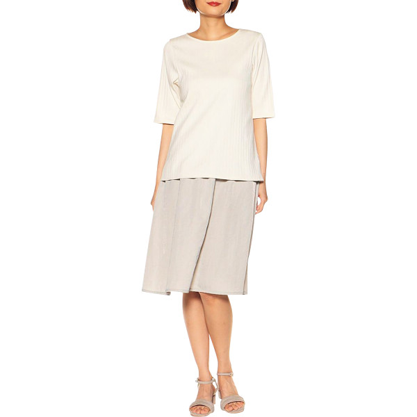 <BARNEYS NEW YORK>オリジナルコレクションより、上質で気品あるハーフスリーブプルオーバーとインナーキャミソールドレスのセットアップドレス。トップスは光沢糸で上品な表情を持ちつつ、裏側は肌に優しいコットン素材で快適な着心地。インナーはナチュラルなワッシャー感のあるタフタ素材で、甘すぎないシルエットが特徴。単品使いもでき、ご自宅で手洗い可能。※アウトレット商品のため返品・交換不可です。