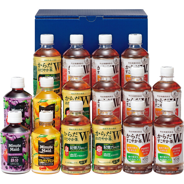 内容 ●からだすこやか茶W+ 350ml×8(特定保健用食品)、からだおだやか茶W 350ml×4(機能性表示食品)(※機能性関与成分:GABA※機能性表示食品 届出番号F258)、ミニッツメイドオレンジブレンド 280ml×2、ミニッツメイドグレープブレンド 280ml×2 【化粧箱入】