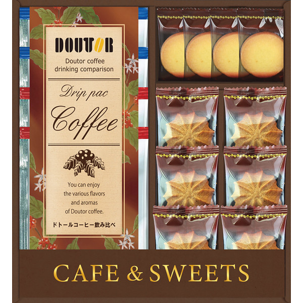 内容 ●ドトールドリップコーヒー(深煎りブレンド・モカブレンド)各7g×各2、コーヒークッキー×6、プレーンクッキー×4 【アレルゲン:卵・乳成分・小麦】 【化粧箱入】