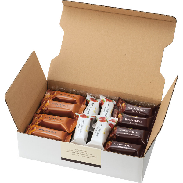 内容 ●ミルフィーユ×24(チョコレート・ストロベリー・アーモンド×各8) 【アレルゲン:乳成分・小麦】 【その他】