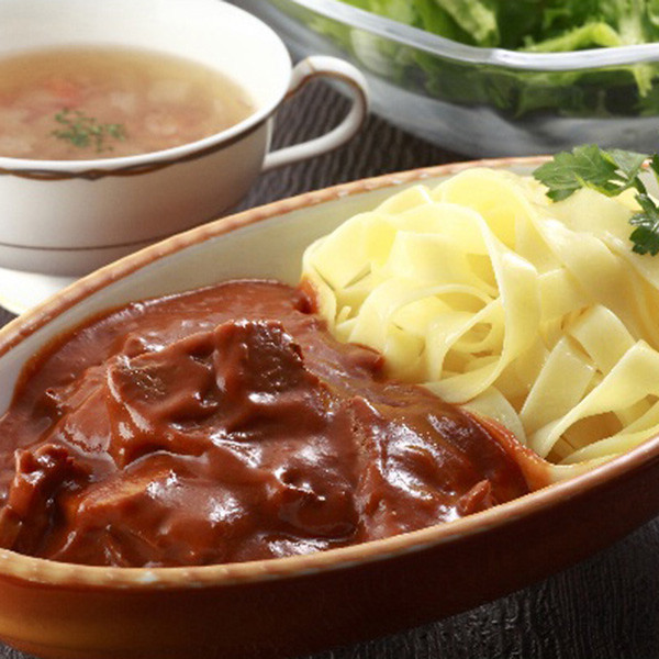 1962年の開業以来、「世界をもてなすホテルオークラ」を合言葉に、日本や世界の賓客をもてなし続けるホテルオークラ。デミグラスソースをベースに果実酒や赤ワインを加えたコクのある風味豊かなソースをベースに、生クリームを加えたまろやかな味わいのビーフストロガノフと、黒毛和牛と野菜の旨みが溶け込んだスパイシーなビーフカレーのセットです。