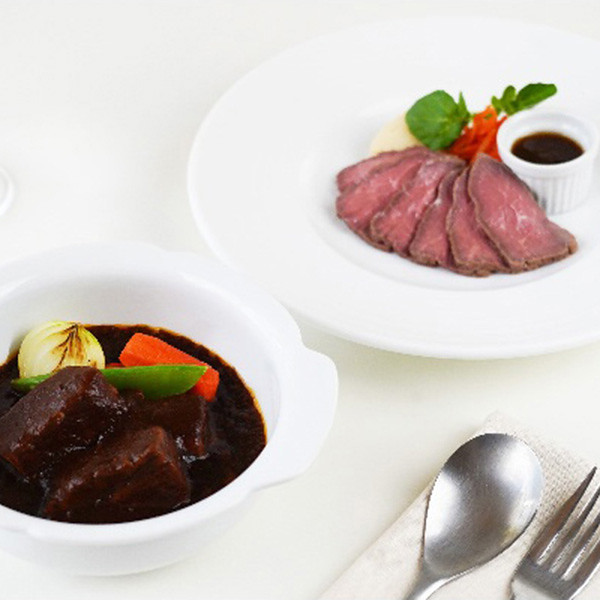 ほろほろとやわらかい牛肉を煮込んだコク深いビーフシチューと、氷温熟成とで旨味を引き出し、シンプルな味付けで低温調理した食べ切りサイズのローストビーフのセットです。