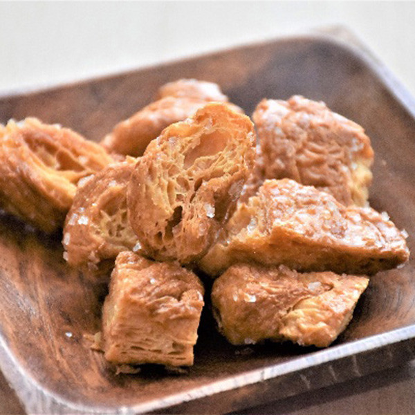 層になったクロワッサンに、ザクザク食感が心地よいザラメ糖を絡め、優しい甘さのラスクに仕上げました。