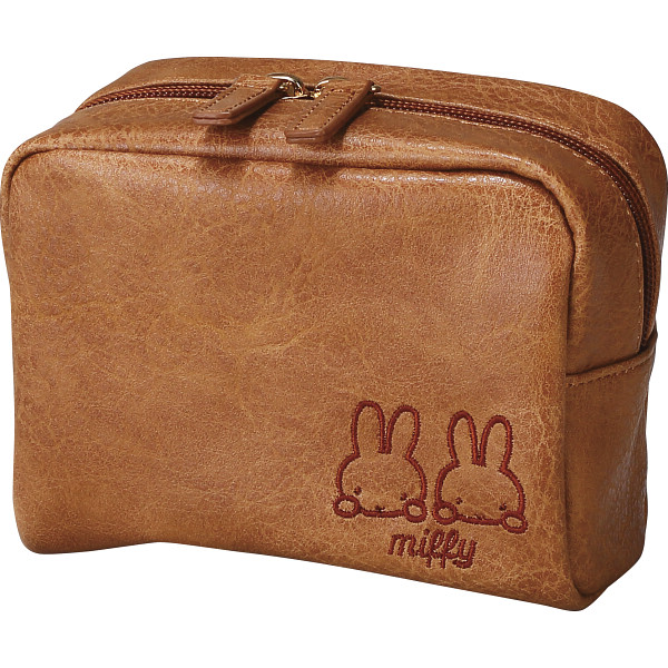 ミッフィーとロゴ刺繍がかわいいポーチです。シボ合皮を使用し、同色のワンポイント刺繍で高級感のあるデザインにしています。内装にはポケットが2つ付いているので、小物等も整理整頓しやすい仕様になっています。ダブルファスナーで開閉しやすく、大きく開き中身が見やすい所もポイントです。大人可愛いデザインで使いやすいポーチです。