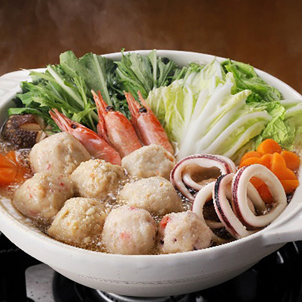 「かに入つみれ」・「えび入つみれ」・「とりごぼうつみれ」・「たこ入つみれ」など、ボリュームいっぱいのつみれを主役に「えび」や「いか」等の魚介を詰め合わせました。「4種のつみれ」と「各具材」の旨味が鍋いっぱいに広がります。ご自宅の野菜も一緒に煮込んでからお楽しみください。