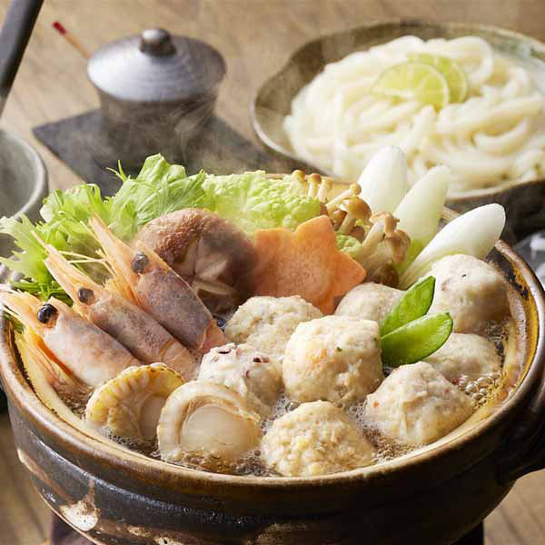 かに、えびなど4種類のつみれの他にも海老、帆立などをあっさりした醤油仕立てのたれでいただく海鮮つみれ鍋の具材を1~2人前の少量タイプにセットしました。お好みで野菜などを足していただくだけで本格的な鍋をお楽しみいただけます。〆はうどんでどうぞ!!