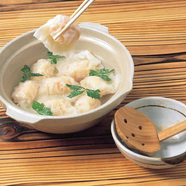 もっちり皮の中には加熱しても硬くならないバナメイ海老の乱切りとたけのこだけでできています。添付のスープでお鍋にしても良し、焼いても、揚げても、蒸しても、レンジでもおいしく召し上がっていただけます。