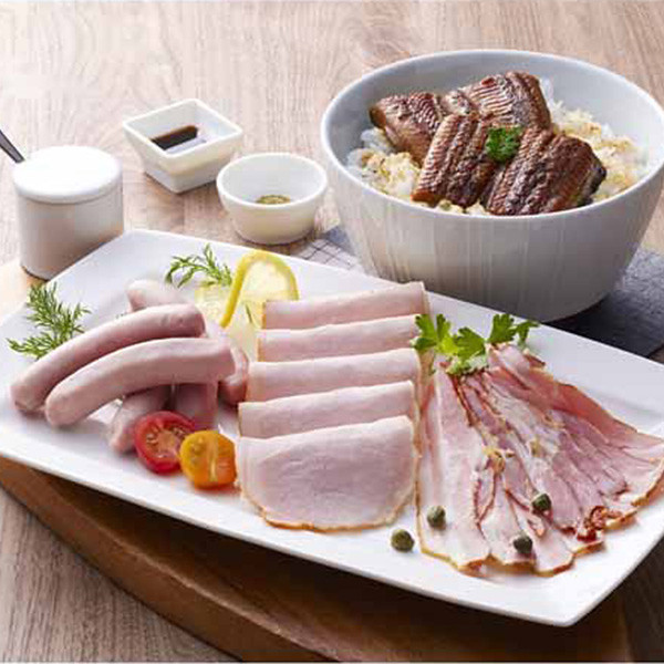 内容 うなぎ蒲焼×3切(計150g)、山椒付きたれ×3、ロースハムスライス60g×1、スモークベーコン50g×1、白ウィンナー100g×1 【賞味期限:30日】 【アレルゲン:卵・乳成分・小麦】 【袋入】
