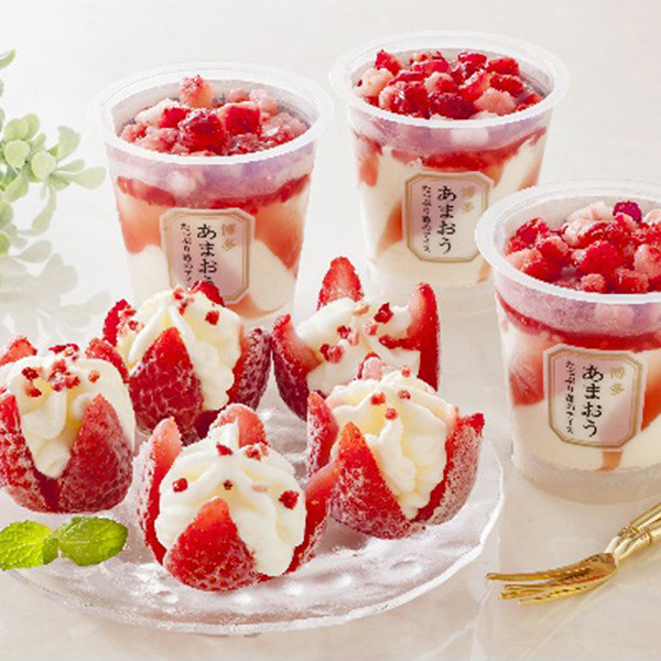 花のように開いた博多あまおうの中にアイスを絞った華やかな花いちごアイスと、博多あまおうの果肉とソースを贅沢に使ったカップアイスのセット。まさにあまおう尽くしのアイスギフトです。