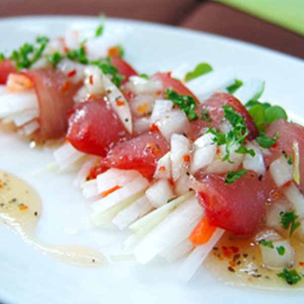 鮪を生ハム仕立てに仕上げスライスしました。燻の薫りとしっとりしたまぐろの生ハムを野菜と一緒にお召し上がりください。