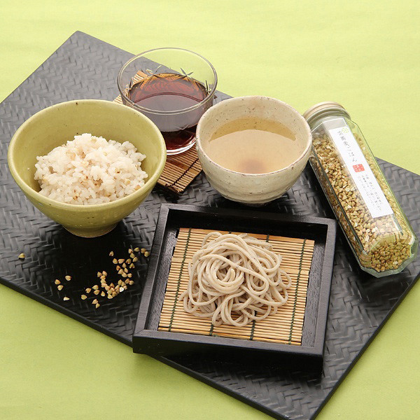 香り高い白地の蕎麦「丹波ノ霧」に深煎りティーバッグ入りのそば茶「霧ノ蕎麦茶」とそばの実の食感と香りが楽しめる「玄そばご飯の素」をセットにしました。