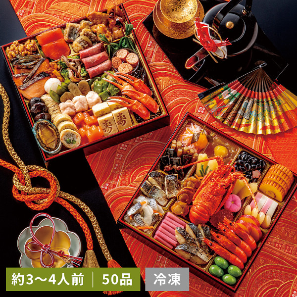 内容 <一の重>25品目:国産紅白なます、金柑甘露煮、きんとん、栗甘露煮、北海道産黒豆の甘煮、百合根梅飾り、伊達巻、国産ごぼうのたたき、にしん入昆布巻き、味付数の子、松前漬け、帆立鼈甲焼き、ボイルイセエビ、いくら醤油漬け、紅花餅、紅かまぼこ、白かまぼこ、白花豆煮、にしん塩麹焼き、こはだかぶら、蓮の芽酢漬け、鰆西京焼き、鳴門金時芋レモン煮、海老艶煮、若桃甘露煮<二の重>25品目:胡桃甘露煮、田作り、小松菜と油揚げ煮、スモークサーモン、淡路島産すずきの南蛮漬け、鶏もも西京焼き、キングサーモン西京焼き、ハリハリ真砂和え、ローストビーフ、キノコとブロッコリーのバジルマリネ、手まり餅、椎茸煮、焼湯葉煮、きぬさや煮、海老入りつみれ、牛蒡煮、万願寺唐辛子と油揚げ煮、活きあわび煮、ささがき信田煮、花こんにゃく煮、寿高野豆腐含め煮、牛  【アレルゲン:卵・乳成分・小麦・えび・かに・くるみ】 【化粧箱入】 【完成品