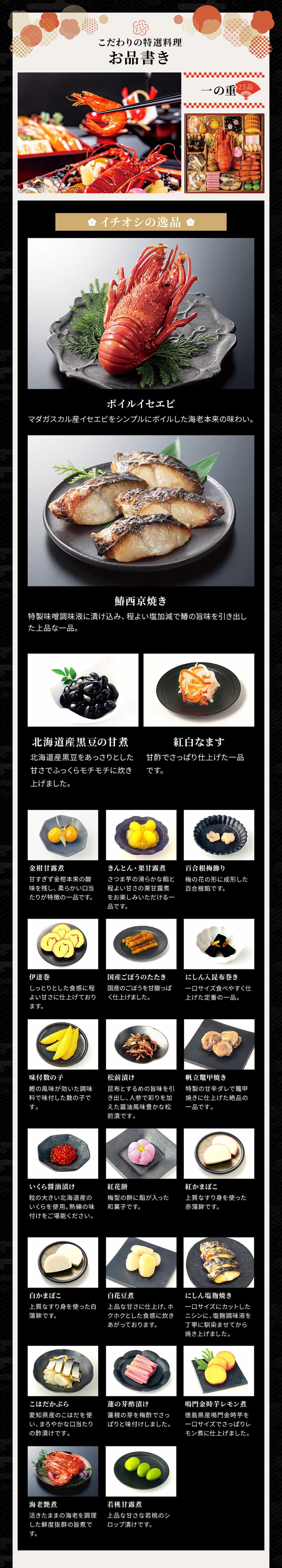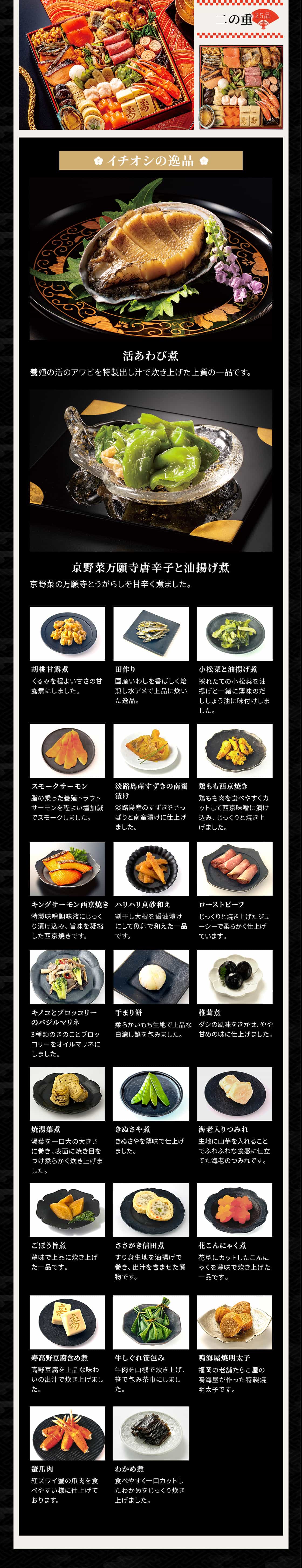 内容 <一の重>25品目:国産紅白なます、金柑甘露煮、きんとん、栗甘露煮、北海道産黒豆の甘煮、百合根梅飾り、伊達巻、国産ごぼうのたたき、にしん入昆布巻き、味付数の子、松前漬け、帆立鼈甲焼き、ボイルイセエビ、いくら醤油漬け、紅花餅、紅かまぼこ、白かまぼこ、白花豆煮、にしん塩麹焼き、こはだかぶら、蓮の芽酢漬け、鰆西京焼き、鳴門金時芋レモン煮、海老艶煮、若桃甘露煮<二の重>25品目:胡桃甘露煮、田作り、小松菜と油揚げ煮、スモークサーモン、淡路島産すずきの南蛮漬け、鶏もも西京焼き、キングサーモン西京焼き、ハリハリ真砂和え、ローストビーフ、キノコとブロッコリーのバジルマリネ、手まり餅、椎茸煮、焼湯葉煮、きぬさや煮、海老入りつみれ、牛蒡煮、万願寺唐辛子と油揚げ煮、活きあわび煮、ささがき信田煮、花こんにゃく煮、寿高野豆腐含め煮、牛  【アレルゲン:卵・乳成分・小麦・えび・かに・くるみ】 【化粧箱入】 【完成品