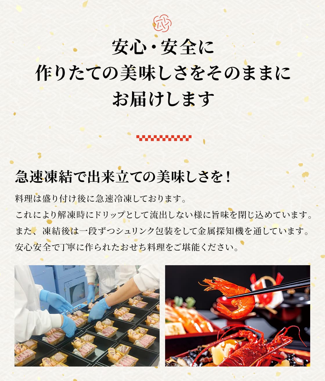 材質 ●重箱盛付済商品●紙製黒重箱入[賞味期限:冷凍保存2026年1月31日/解凍したおせち料理は、お早めにお召し上がりください。]※解凍方法:冷蔵庫/約24時間