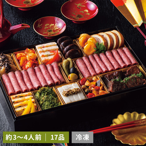 内容 ●黒毛和牛モモローストビーフ<赤ワイン漬け)210g、海老のアンチョビ入りタプナードソース×4尾、パプリカとモッツァレラチーズトマトソースカプレーゼ×3枚、サーモンテリーヌ×4枚、赤パプリカマリネ×2枚、干し椎茸のバルサミコ酢煮×4個、クリームチーズ杏子×4個、ハンバーグパイ包み焼き×4切、コルニッション×2個、スタッフドオリーブ×2個、ブラックオリーブ×2個、鶏と野菜のチーズ焼き×4切、黄色パプリカマリネ×2枚、帆立の葱生姜ジェノベーゼソース掛け×4枚、ポーク白ワイン煮粒マスタード掛け×4枚、ラタトゥイユ40g、黒毛和牛赤ワイン煮100g、ローストビーフソース20g×2袋、西洋わさび4.5g×2袋 【賞味期限:30日】 【アレルゲン:卵・乳成分・小麦・えび】 【その他】