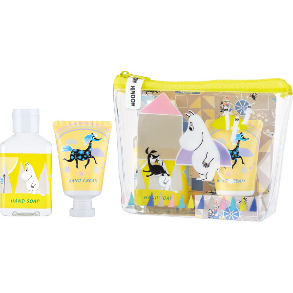 ムーミン谷の仲間たちが描かれたポーチに、ミニサイズのハンドソープとハンドクリームが入ったセット。小物が入れられる便利なポーチ入り。小物が入れられる便利なポーチ入り。
