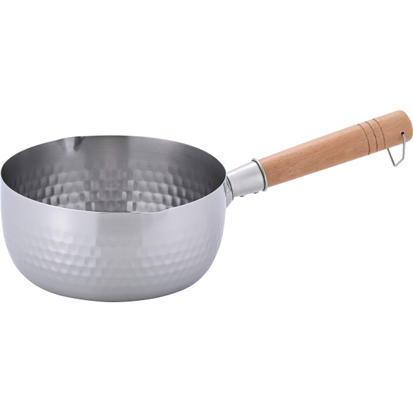 清潔でサビにくい、ステンレス製の雪平鍋。容量たっぷりの深型設計。両側に注ぎ口がついているので、移し替えしやすい。計量に便利な目盛付き。手になじみやすい木製ハンドル。リング付だからフック掛けの収納も可能。ガス火はもちろんIH調理器でも使用可能。