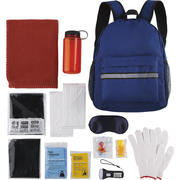 内容 ●反射テープ付防災リュック・2WAYライト(単3乾電池×1本使用・別売)・携帯トイレ3回分(凝固剤・処理袋×各3)・ブランケット・給水用ボトル(口径=5.5cm、満水容量=約700ml)・軍手・レインコート・アイマスク・PETアルミブランケット・耳栓・ホイッスル・ゴミ袋×各1、個包装マスク×2  【袋入】 【完成品】