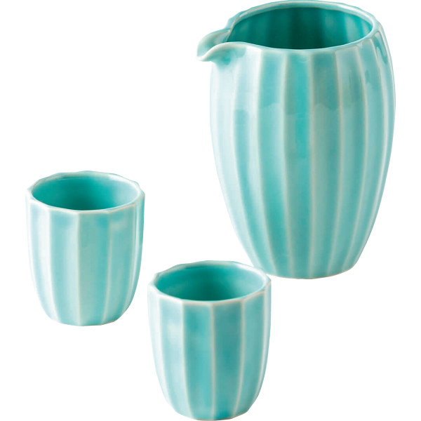 しのぎ模様と青磁釉薬が美しい高級感ある形の酒気セットです。