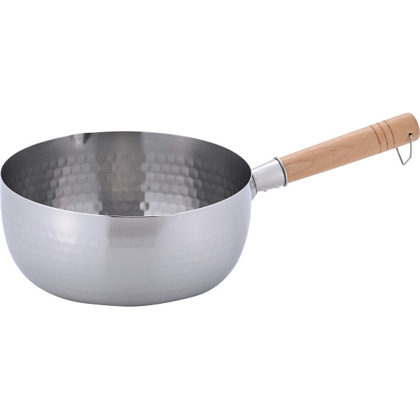 清潔でサビにくい、ステンレス製の雪平鍋。容量たっぷりの深型設計。両側に注ぎ口がついているので、移し替えしやすい。計量に便利な目盛付き。手になじみやすい木製ハンドル。リング付だからフック掛けの収納も可能。ガス火はもちろんIH調理器でも使用可能。