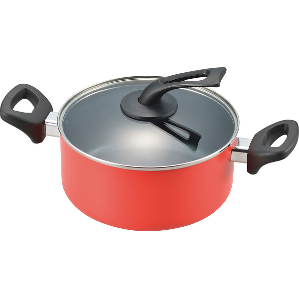 内面はフッ素樹脂加工でお手入れしやすいアルミ鍋。ガラス蓋の取っ手はスタンドさせて置くこともでき、お料理のしやすい環境づくりに一役かいます。