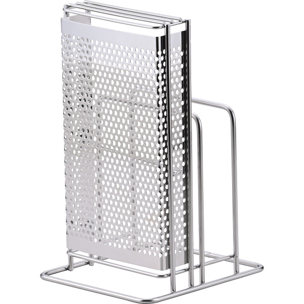 包丁2本、まな板1枚、シートまな板1枚が収納可能。高品質でサビにくい18-8ステンレス製だから、水回りでも安心してご使用頂けます。パンチングプレートを使用しているので、キッチンの外観を損ねず、キレイに包丁とまな板が収納できます。刀身18cm以下の包丁、厚さ3cm以下のまな板に対応しています。