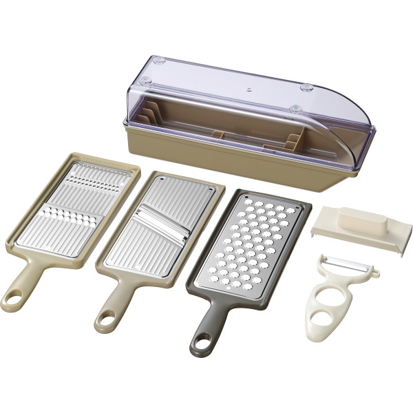 内容 ●スライサー・千切り・つま切り・おろし・三徳ピーラー・安全ホルダー・収納ケース・容器×各1 【化粧箱入】 【完成品】