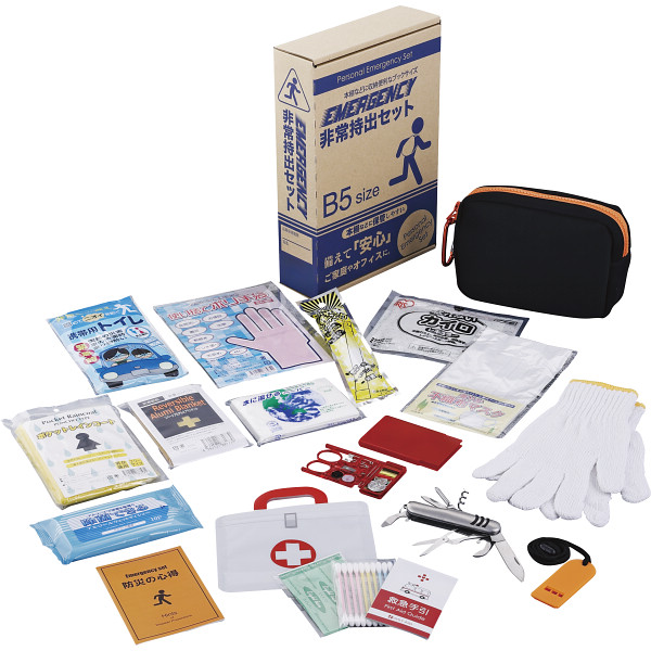 内容 ●収納ポーチ・ホイッスル・マスク・軍手・アルミブランケット・防災の心得・発光スティック・カイロ・レインコート・携帯用トイレ・8徳ナイフ・ソーイングセット・水に流せるペーパー・除菌アルコールウェットティッシュ・救急4点セット(絆創膏=医療機器届出番号:27B3X00138000001)・ポリ手袋×各1 【化粧箱入】
