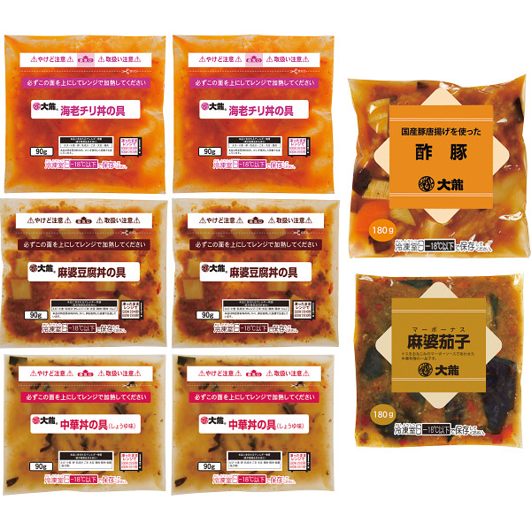 内容 ●大龍ミニ中華丼の具(醤油味)90g×2、大龍ミニ海老チリ丼の具90g×2、大龍ミニ麻婆豆腐丼の具90g×2、大龍酢豚180g×1、大龍麻婆茄子180g×1 【アレルゲン:卵・乳成分・小麦・えび】 【ボール箱入】
