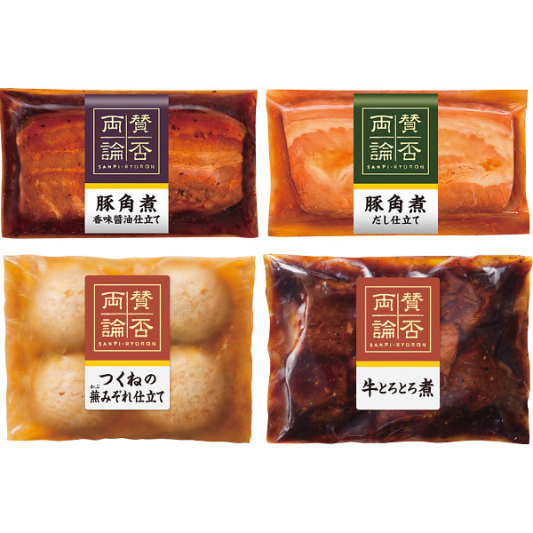 内容 ●「賛否両論」(豚角煮香味醤油仕立て130g×2、つくねの蕪みぞれ仕立て180g、牛とろとろ煮150g、豚角煮だし仕立て130g) 【アレルゲン:卵・乳成分・小麦】 【化粧箱入】