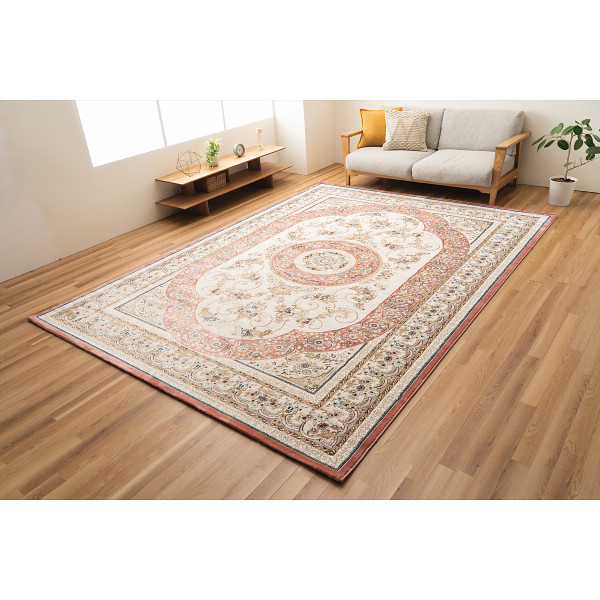 トルコ製のウィルトンラグです。シュリンク糸を使用して柄に立体感を出しています。ローズ色とベージュ色2色展開。丈夫で長持ちする商品です。240×330cm約6畳サイズです。